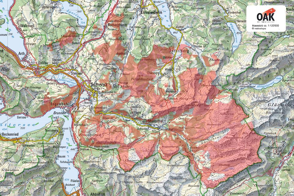 Das Grundeigentum der Oberallmeindkorporation Schwyz (OAK) befindet sich hauptsächlich im Bezirk Schwyz. Kleinere Flächen liegen zusätzlich auf Boden des Bezirks Einsiedeln sowie den Kantonen Zug, Glarus und Uri. Heute beträgt das Grundeigentum der OAK gesamthaft rund 24’000 Hektaren.