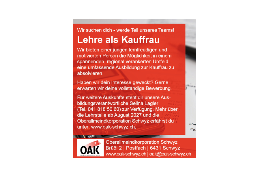 Hast du Interesse ab August 2027 deine Lehre als Kauffrau EFZ bei der Oberallmeindkorporation Schwyz zu machen?